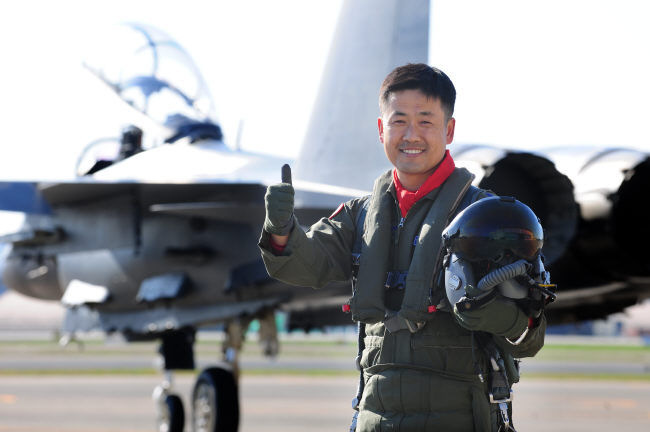 2011년 공군 최고의 조종사를 일컫는 `탑건'으로 선정된 공군11전투비행단 신건우 소령이 자신의 애기인 F-15K 앞에서 포 즈를 취하고 있다. 부대제공