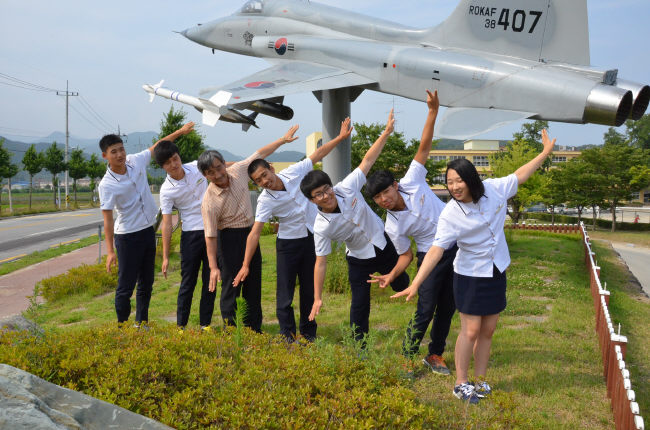 | 경북항공고등학교 배창식 교장과 학생들이 학교정문 앞에서 재밌는 포즈를 취하며 환하게 웃고 있다. |
