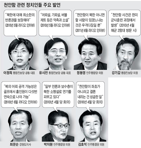 야권(野圈)은 사건 발생 초기부터 '좌초설' '피로파괴설' '미군 함정 충돌설' 등 항간에 떠도는 미확인 괴담을 여과 없이 주장했다. 제1야당인 민주당이 앞장섰다. 그 결과 각종 음모론은 '상당한 근거'가 있는 양 확산됐다. 미국 연방 상원이 만장일치로 채택한 결의안에서 천안함의 침몰 원인을 '외부폭발'로 규정한 것과 정반대였다. 여당인 새누리당은 인터넷 등을 통해 급속도로 퍼지는 괴담에 허둥대며 속수무책으로 의혹이 확산되는 것을 방치했다.