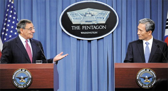 한·미 연례안보협의회(SCM) 참석차 미국을 방문 중인 김관진(오른쪽) 국방장관이 24일 미국 워싱턴DC의 국방부 청사에서 회담을 마친 뒤 리언 패네타 미 국방장관과 공동 기자회견을 하고 있다. 김 장관은 이날 오는 2015년 말 전시작전권 이양에 맞춰 해체하기로 한 한미연합사를 대체할 미니 연합사를 신설하는 방안을 미국과 논의하기로 했다고 밝혔다. /신화 뉴시스