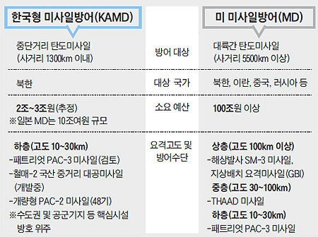 김관진 국방장관은 이날 SCM 직후 가진 기자간담회에서 "MD 체계에 들어가는 것은 불필요하다"고 했다. 한국의 KAMD는 10~30㎞의 낮은 고도에서 적 미사일을 요격하는 하층(下層) 방어 체계라면, 미국의 MD는 고도 10~1000㎞에 이르는 광범위한 권역에서 요격하는 체계다. 김 장관은 "한국은 하층 방어 능력도 아직 제대로 갖추지 못했다"며 "하층 방어 능력 은 강화하되 (미국과) 연합 정보력은 갖출 수밖에 없다"고 말했다. 김 장관은 KAMD 요격 능력을 강화하기 위한 방안으로 "(패트리엇) PAC-2를 PAC-3 체계로 강화하겠다"고 했다. PAC-2는 고도 15㎞ 내에서 제한된 미사일 요격 기능을 보유한 반면, MD 체계에서 하층 요격을 담당하는 PAC-3는 고도 30㎞에서 '직접 타격(hit-to-kill)'이 가능하다.